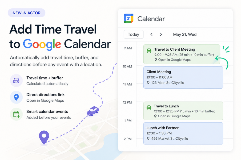 That’s the gap we fixed with a simple idea inside Actor: Travel Time App automatically add travel time before your events.