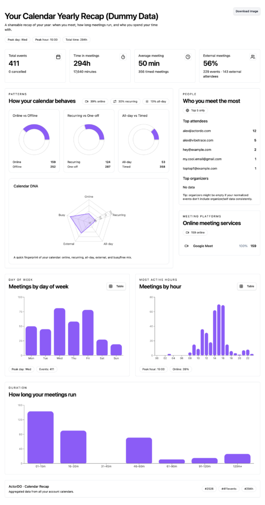 It processes all events from all calendars under your account. Extracts the following insights: