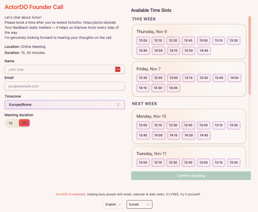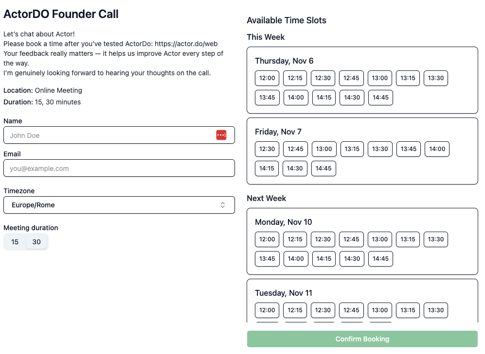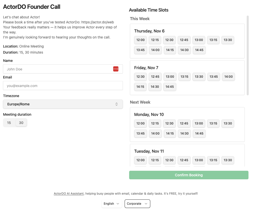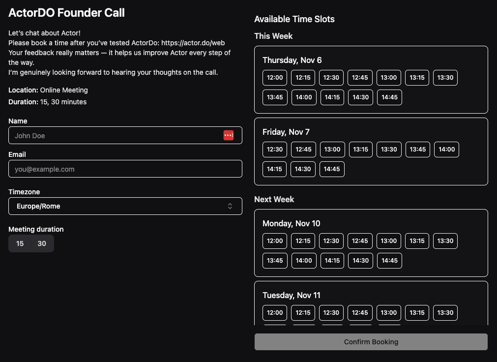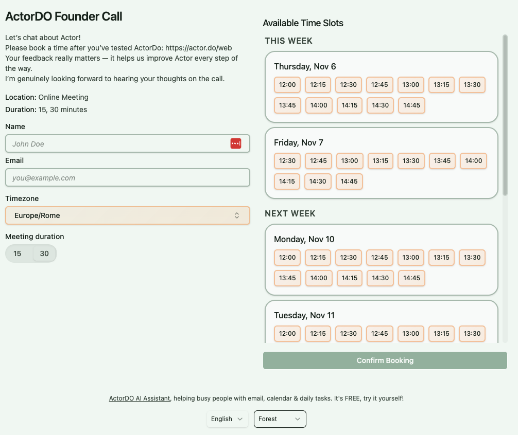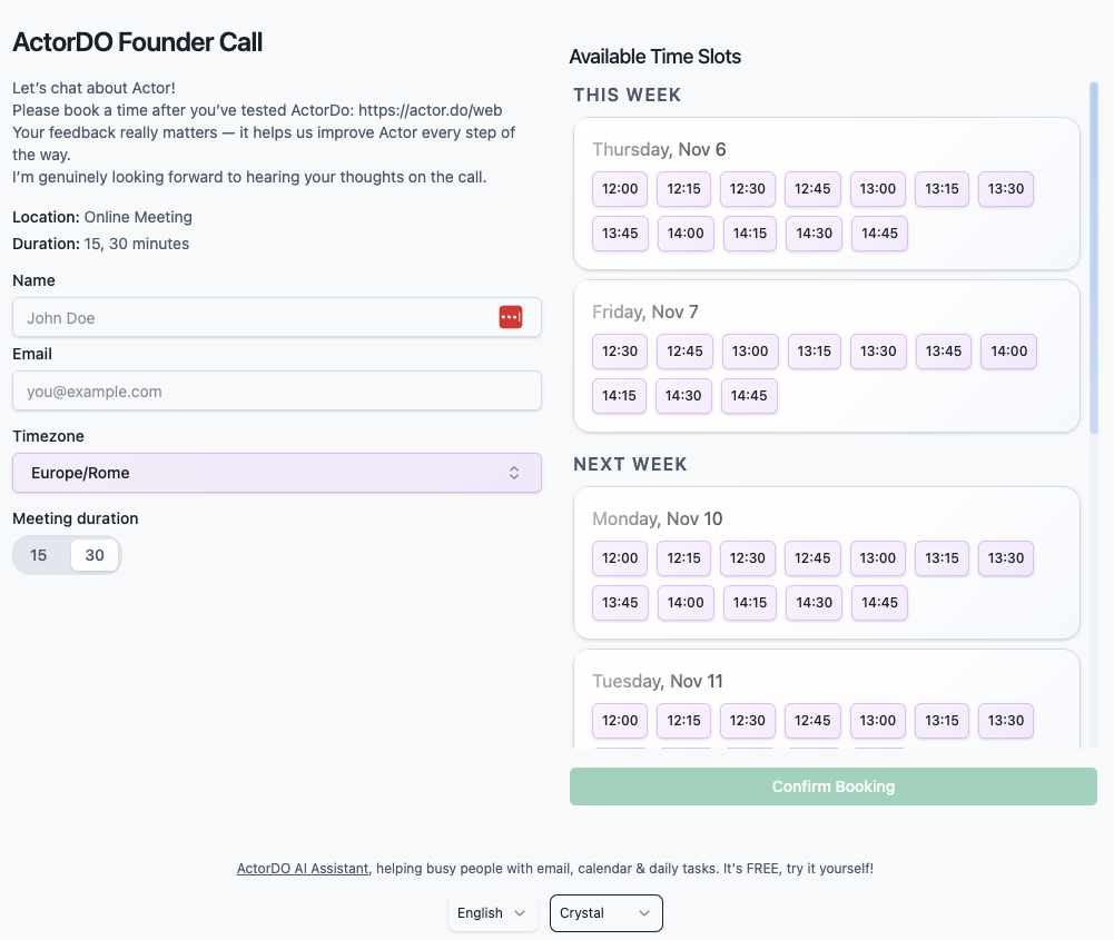 If you’re looking for an integrated and free Calendly/Cal/Tidycal/Chilipiper alternative that is free and comes with 2 unique features, ActorDo is probably the best option.