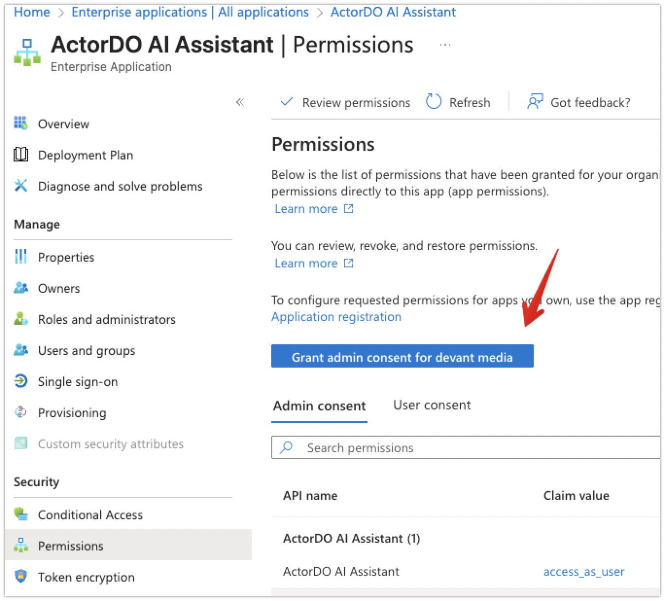 Go To Permissions Blade and Grant Admin Permissions from here