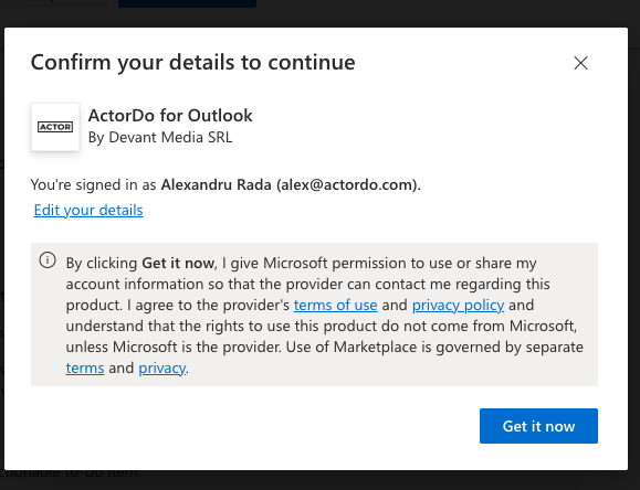 ActorDo on Appsource. Install it directly from Outlook AppSource, this is currently the preferred way to use ActorDo directly in your Outlook