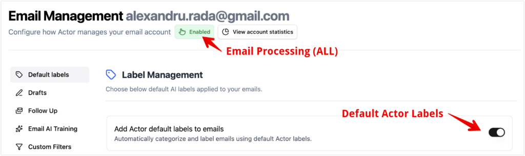 If you’re looking to temporarily deactivate Actor to manage your email accounts, you can simply toggle email labelling and draft creation.