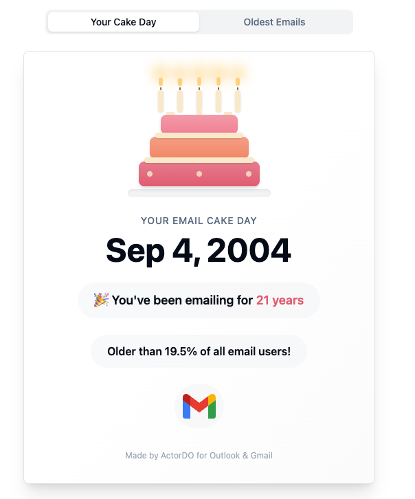 Is the oldest ever email you either sent or received. You can get this information with ActorDo Email Cake Day app.