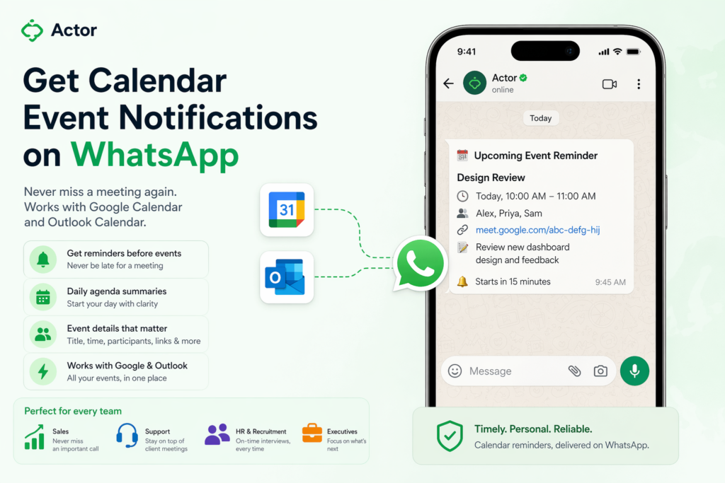 With Actor, you can receive calendar reminders directly on WhatsApp, for both Google Calendar and Outlook. It’s simple, but the impact is huge.