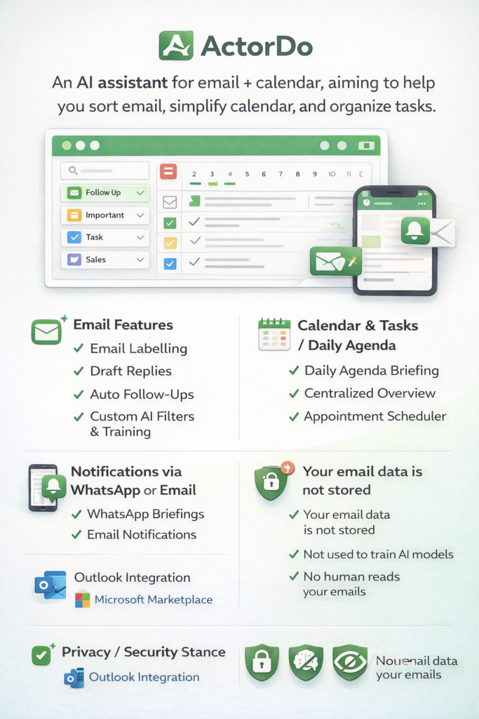 ActorDo — an AI productivity assistant for your email + calendar + tasks that automates email drafting, labeling, follow-ups, task extraction, and summaries right inside Gmail/Outlook.