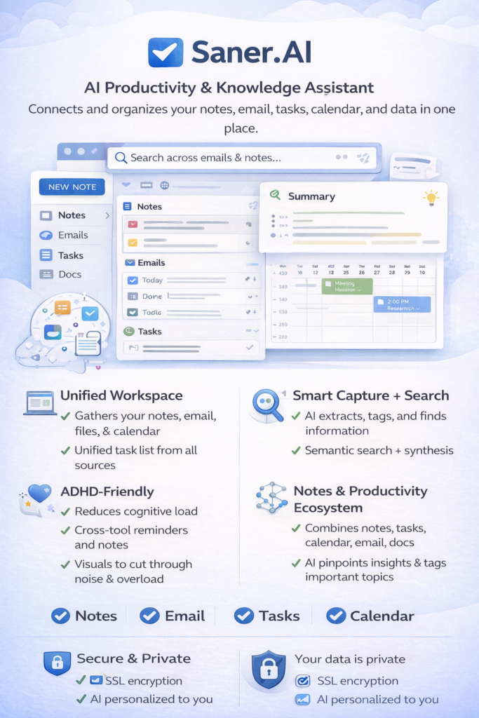 Saner.AI — an AI “personal assistant” focused on notes, email, calendar, tasks, and knowledge management in one unified space, with semantic search and synthesis across your data. It’s advertised as friendly for people managing cognitive load and context switching.